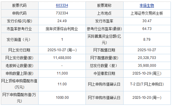 苏州丰贝生物科技股份有限公司 保荐机构(主理人):国泰海通证券股份有限公司 发行情况: 公司简介:公司是废弃资源综合利用领域的高新技术企业,主要生产废旧油脂再生产品。丰贝生物的大股东、现任董事为平原。截至招股书签署之日,平原直接持有公司59.78%的股份,通过中和业务控制公司16.94%的股份,通过富北汇盈控制公司8.68%的股份。综上,平根为丰贝生物科技的控股股东及实际控制人,通过直接和间接方式合计控制公司85.40%的股份。同时,Hiragen 先生担任公司总裁。2025年10月17日披露的丰贝生物二次公开发行主板上市招股书显示,公司拟募资7.5亿元用于“新建年产30万吨油酸甲酯、1万吨工业混合油、5万吨农业微生物菌剂和1万吨微生物肥料复合体项目”。副产生物柴油5万吨,甘油8200吨。丰贝生物2025年10月24日披露的首次公开发行股票并在主板上市表明,以每股24.49元的发行价为基础,发行3590万股新股,若本次发行成功,公司预计募集资金总额为87,919.1万元。扣除发行费用后的净收益约人民币 8475.33万元(不含增值税)预计79443.77万元。